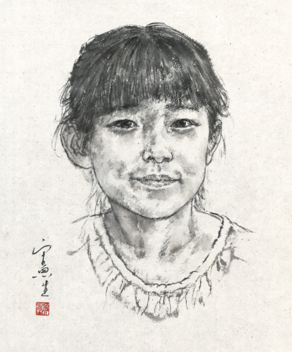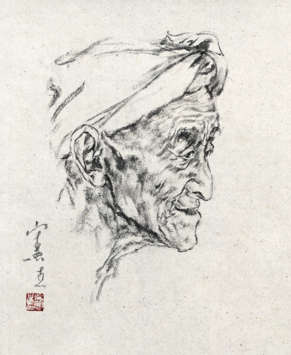 三、头部情景的线条勾画,随头部骨骼、肌肉的形体布局变更而变更,头部外形的勾画,如额头、眉弓、颧骨、下巴等处骨骼流露,勾线宜坚硬,其他肌肉滚动可相应疏忽。晚年人宜柔中睹刚,用笔宜拙;青丁壮男性用线宜厚实,用笔宜稳重;青年女性及儿童用线宜圆润,用笔宜畅达。