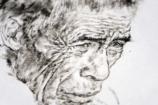 2. 鼻。鼻梁有鼻骨与鼻软骨,用笔要挺硬,鼻孔因深陷故用墨用线宜稍重,鼻翼局部因与脸颊相连,用墨宜稍淡。